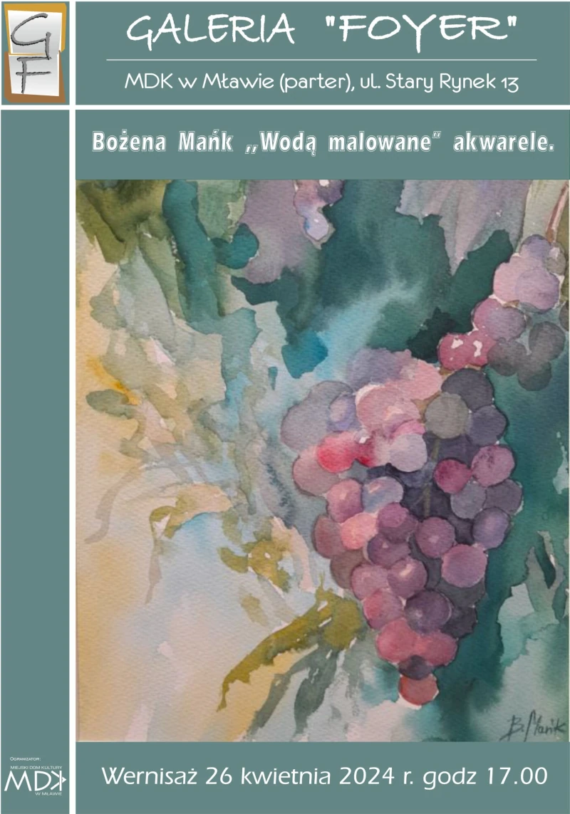 26 kwietnia 2024 roku w Galerii Foyer MKD w Mławie odbył się wernisaż wystawy „Wodą malowane” Bożeny Mańk. Artystka pochodzi z Mławy i była to pierwsza wystawa zorganizowana w jej rodzinnym mieście. Fotorelacja